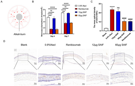 The mouse cornea was cauterized to stimulate the regeneration of new blood vessels at the corneal limbus using filter paper sheets soaked in an alkaline solution. The experimental manipulation is shown in Figure 4A. The drug was administered via subconjunctival injection. The blank control group received no treatment. All alkali-burned mice were randomly separated into four groups (n = 9): the negative control group (0.9% NaCl, 20 μL); the positive control group (Ranibizumab, 10 μL); the high-dose group: 60 μg of SAIF (3 mg/mL, 20 μL); the low-dose group: 12 μg of SAIF (0.6 mg/mL, 20 μL). Photographs were taken at 4 d and 7 d after administration to count the area of the corneal neovascular network in mice.