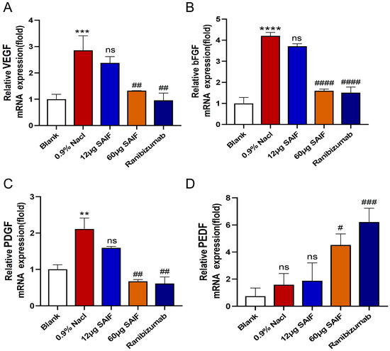 Figure 5. SAIF affects the mRNA expression of angiogenic factors in mouse corneal. (AD) Mouse corneas were taken and RNA was extracted for qRT-PCR to assess the mRNA expression levels of angiogenic factors VEGF, bFGF, PDGF, and PEDF. Values are the mean ± SD values of three experiments performed in triplicate, for blank vs. 0.9% NaCl group, ** p < 0.01; *** p< 0.001; **** p < 0.0001; ns. no significant difference; #, for the drug treatment vs. 0.9% NaCl group, #, p < 0.05; ## p < 0.01; ### p < 0.001. #### p < 0.0001; ns. no significant difference.
