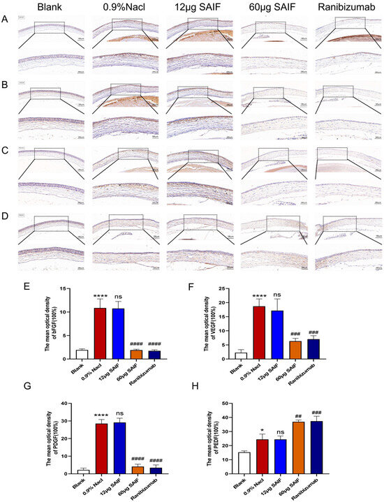 Figure 6. SAIF affects the protein expression of angiogenic factors in mouse corneas. Immunohistochemistry staining in the cornea of mice (100×, 200×) and the mean optical densities of VEGF (A,E), bFGF (B,F), PDGF (C,G), and PEDF (D,H) measured by ImageJ 1.52a software. Results are the mean ± SD values of three experiments performed in triplicate. *, for the blank vs. 0.9% NaCl group, * p < 0.05; **** p < 0.0001; #, for drug treatment vs. 0.9% NaCl group, ## p < 0.01; ### p < 0.001; #### p < 0.0001; ns. No significant difference.