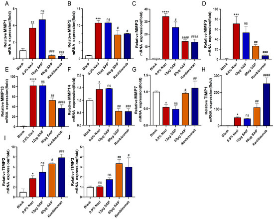 Figure 7. SAIF affects the expression of MMPs in mouse corneal. (AJ) Mouse corneas were collected and RNA was extracted for qRT-PCR to detect the mRNA expression levels of MMP1, MMP2, MMP3, MMP7, MMP9, MMP13, MMP14, TIMP1, TIMP2, and TIMP3. The mean ± SD of three separate experiments were used to express the values. *—the blank vs. the 0.9% NaCl group, * p < 0.05; ** p < 0.01; *** p < 0.001; **** p < 0.0001; ns. no significant difference; #, the drug group vs. the 0.9% NaCl group, # p < 0.05; ## p < 0.01; #### p < 0.001; #### p < 0.0001; ns. no significant difference.