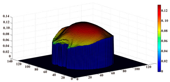 In this study, the PDF-based BSS method was selected to obtain the B 1 + magnitude map for relative permittivity imaging. The feasibility of PDF-based BSS sequence imaging was firstly validated. As shown in Figure 3, the three-dimensional view clearly displays the variation tendency of the B 1 + magnitude. The B 1 + magnitude gradually increased from the sides to the center. The continuity of distribution well meets the needs of the RF field [34]. Thus, the feasibility of the multi-channel combination BSS method was verified.