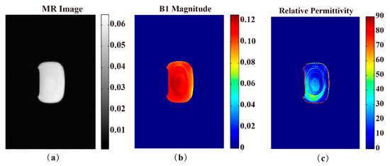 Figure 4. Results of the Gd phantom imaging using 3T, including MR image (a); magnitude of the B 1 + field (b); the reconstructed result of relative permittivity (c). Every three ROI values were chosen to calculate the permittivity. After that, we obtained the average permittivity of the entire ROI as 52.4130 ± 1.9188.