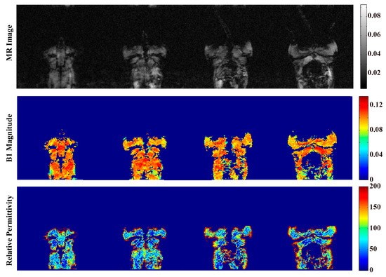 Figure 5 exhibits the rat in vivo experiment results at 3T. Four slices are shown. The first row contains the MR image, the second row includes the magnitude of the B 1 + field, and the third row displays the relative permittivity value. The average permittivity of each slice was calculated. On this basis, we further calculated the average relative permittivity across all levels. The reconstructed value of the relative permittivity of the rat leg muscles was 54.0530   ± 4.0269.