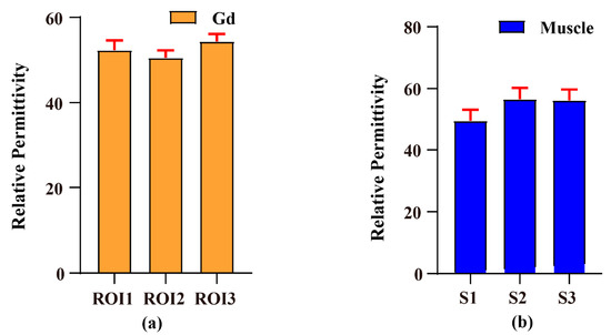 Figure 6 illustrates the results relative permittivity of the Gd phantom and the rat leg muscle. The distribution of relative permittivity was not uniform. We chose the region of interest (ROI) to calculate the average permittivity. The ‘mean ± SD’ values of permittivity of each ROI were 52.3078 ± 2.0386, 50.5489 ± 1.7194, and 54.3822 ± 1.7154, as shown in Figure 6a. The average value of the entire phantom was 52.4130 ± 1.9188. Three slices of permittivity images of the rat leg muscle were chosen to calculate the average permittivity of the rat leg muscles. The ‘mean ± SD’ values of permittivity from slice 4 to slice 6 were 49.4100 ± 12.9257, 56.5933 ± 13.1388, and 56.1556 ± 12.5540, respectively, as shown in Figure 6b. The imaging accuracy significantly improved in in vivo imaging compared to existing research results, especially in the global imaging results [27,29]. Then, we calculated the average value of all the slices.