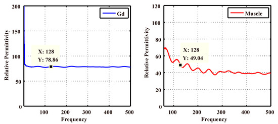 Figure 7. Relative permittivity of Gd phantom and rat muscles measured by the open-ended coaxial probe at 0–500 MHz. The x-axis represents the frequency, and the y-axis is the value of the relative permittivity. The blue line shows the relative permittivity of Gd at the frequency from 0 to 500 MHz and the red line displays the relative permittivity of muscle. The two black points on the blue and red lines point out that the relative permittivity was 78.86 of Gd and 49.04 of muscle at a frequency of 128 MHz.