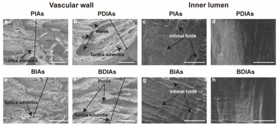 SEM images of the DIAs. PIAs: porcine intercostal arteries; PDIAs: porcine decellularized intercostal arteries; BIAs: bovine intercostal arteries; and BDIAs: bovine decellularized intercostal arteries. Microscopic observation of DIAs: inner lumen (c,d,g,h), scale bar: 10 μm; vascular wall (a,b,e,f), scale bar: 200 μm. Native vessels (a,c,e,f) and DIAs (b,d,f,h) of porcine (a–d) and bovine (e–h) origin.