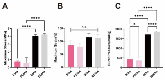 Mechanical characterizations of the DIAs. PIAs: porcine intercostal arteries; PDIAs: porcine decellularized intercostal arteries; BIAs: bovine intercostal arteries; and BDIAs: bovine decellularized intercostal arteries. Maximum stress (A), maximum strain (B), and burst pressure (C) for PIAs, PDIAs, BIAs, and BDIAs. Burst pressure was measured using a manometer; maximum stress and maximum strain were obtained using a tensile tester. n ≥ 3, * indicates p < 0.05, **** indicates p < 0.0001. “n.s.” indicates no significant differences between comparison groups.