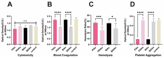 Biocompatibility and hemocompatibility of the DIAs. PIAs: porcine intercostal arteries; PDIAs: porcine decellularized intercostal arteries; BIAs: bovine intercostal arteries; and BDIAs: bovine decellularized intercostal arteries. (A) CCK-8 assay of the HUVECs cultured for three days, with and without medium supplemented with extract solution of each graft, respectively. “control” and “-” denote the same negative control group in which the HUVECs were cultured using normal medium. (B) Blood coagulation, (C) hemolysis, and (D) platelet aggregation for PIAs, PDIAs, BIAs, and BDIAs. The negative control consists of whole rabbit blood/diluted rabbit blood/resuspended platelet solution that did not come into contact with the material. n ≥ 6, * indicates p < 0.05, *** indicates p < 0.001, **** indicates p < 0.0001. “n.s.” indicates no significant differences between comparison groups.