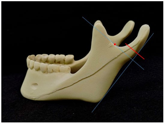 In this study, an in vitro mandible model (#1337-3, Mandible with Teeth, Foam Cortical Shell and Cancellous Inner Material, Sawbones, Pacific Research Laboratories Inc., Washington, DC, USA) was utilized in the biomechanical experiments. This synthetic bone model has been previously documented in the literature as a viable substitute for bones in orthopedic medical devices and biomechanical experiments [12,13]. The condylar neck fracture was defined as described in the AO-CMF classification [14]: an imaginary line of the lateral mandibular border was drawn, and a perpendicular line crossing the lowest point of the mandibular sigmoid notch was thus designed; the latter line was then translated upwards 2 mm to form the cutline (marked in red) on the model for fracture simulation (Figure 2). Two groups of different fixation methods were demonstrated in Figure 3 as follows: single-long-plate groups (13 samples) were fixed with a four-hole mini-plate and four screws (Leibinger 2.0 mm miniplate system), while the double-short-plate groups (13 samples) were fixed with two parallel two-hole mini-plates and four screws. The plates were placed perpendicular to the fracture line created. We then performed the compression biomechanical experiment by utilizing the universal testing machine of MTS Q-test/10 (MTS Systems Co., Evanston, IL, USA) to evaluate the resistance of the fixed fracture models. Two reference points were defined and marked on the Sawbones model, with point A on the fracture line’s posterior side (condyle part) and point B on the anterior side (jaw part). The model was held and fixed at the incisors, and then the jig was applied to the mandibular condyle to form a consistent downward displacement of 5 mm (Figure 4). We then estimated the displacements of points A and B using the three-dimensional digital image correlation [15] method to compare the coordinates before and after the displacement-controlled compression test.