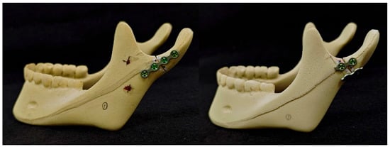 - Lin, T.S.; Chiu, T.F.; Hsu, J.T.; Chen, C.C.; Chang, L.R.; Huang, H.L. Biomechanical Evaluation and Factorial Analysis of the 3-Dimensional Printing Self-Designed Metallic Reconstruction Plate for Mandibular Segmental Defect. J. Oral Maxillofac. Surg. 2022, 80, 775–783. [Google Scholar] [CrossRef] [PubMed]