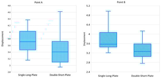 In the compression test of the Sawbones model, the displacements of the posterior point A were comparable in both fixation groups (p = 0.112), though slightly more in the single-long-plate group. In contrast, the displacements of the anterior point B were significantly greater in the single-long-plate group (p = 0.043) (Table 2). Interquartile range results are also shown in Figure 5.