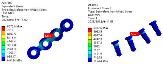 Results of finite element analysis for double-short-plate fixation (left: plate; right: screw).