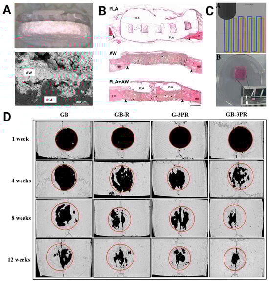Three-dimensional-printed PLA in bone tissue engineering. (A) Composite disks composed of PLA and the bioactive ceramic apatite-wollastonite (AW) (top: photograph, bottom: scanning electron microscopy image of interface) showed (B) higher bone formation than either PLA or AW alone in rat calvarial defects after 12 weeks as seen via hematoxylin and eosin staining (bar = 1 mm; HB, host bone; arrows, new bone; arrowheads, defect margins; *, residual AW). Images were adapted with permission from Tcacencu et al. []. (C) Dual extrusion 3D-printed in situ vascularized scaffolds containing bone marrow-derived mesenchymal stem cells (MSCs) and rat aortic endothelial cells (RAOECs) or GB-3PR (top: path planning; bottom: printed scaffold) (D) exhibited higher bone formation than the other groups (i.e., single-nozzle 3D-printed gel with BMSCs [GB], single-nozzle 3D-printed gel with BMSCs and RAOECs [GB-R], and dual-nozzle 3D-printed gel with RAOECs [G-3PR]) in rat calvarial defects after 12 weeks as seen via computed tomography. Images were adapted with permission from Shen et al. [].