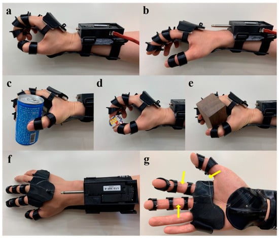 Three-dimensional-printed PLA-based orthotic device. The electromyography-responsive hand orthosis has a linear motor that can be activated to assist in wrist extension and facilitate the tenodesis grasp (a). Once the motor goes back into place, the extended wrist relaxes back into a neutral position (b). The device has been used to pick up a can, dice, and a wooden block (c–e). Top view of the device (f). Bottom view of the device (g) showing the nylon threads (yellow arrow) connecting the splint and rings. Images were adapted with permission from Yoo et al. [].