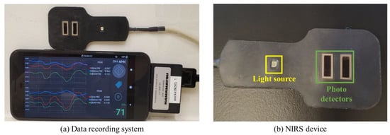 Data recording system and NIRS device. (a) The signals measured by the NIRS device are converted into O2Hb, HHb, THb, and StO2 in real time and recorded on the connected mobile phone. (b) The NIRS device consists of one light source and two photodetectors.