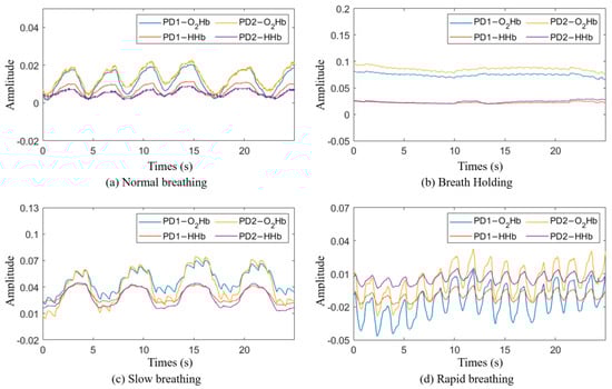 The experiment for data collection was conducted at an outpatient clinic at the National Institutes of Health (NIH) Clinical Center. During data collection, the NIRS device was attached to the participants’ chests using medical-grade, double-layer tape. To acquire data on normal breathing, each participant comfortably sat in a chair in a resting position and breathed normally through their mouth or nose for 5 min. The participants then performed a breath holding task where they were asked to exhale and hold their breath for as long as possible, up to two minutes. After resting for two minutes, the task was repeated twice for a total of three repetitions. The participants then rested for five minutes before starting the slow breathing task. During slow breathing, participants took ten breaths per minute for two minutes, rested for two minutes, and then repeated. The slow breathing task ended with a two-minute rest followed by the rapid breathing task, where the participants breathed thirty times per minute for two minutes. This task was also repeated following a two-minute rest period. Figure 2 shows the breathing signals for each class obtained through the NIRS device.