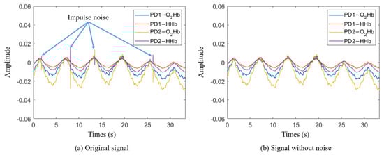 Impulse noise removal: (a) original signal from NIRS device, (b) signal with impulse noise removed.