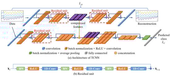 Architecture of TCNN. (a) The autoencoder network is used to generate compressed features from the input data; then, the compressed features are combined with deep features extracted from the classification network. (b) The structure of a residual unit.