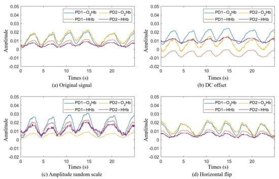 Example of the data augmentation methods. (a) The original signals recorded using the mobile phone. (b) The result of adding DC offset values of 0.004, −0.012, −0.007, and 0.005 to the PD1-O2Hb, PD1-HHb, PD2-O2Hb, and PD2-HHb signals, respectively. (c) The result of multiplying the PD1-O2Hb, PD1-HHb, PD2-O2Hb, and PD2-HHb signals by scale values of 1.5, 2, 0.4, and 2.3, respectively. (d) The result of a horizontal flip occurring with a 50% probability.