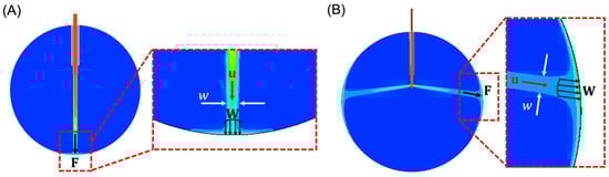 - The cross-sectional area of the infusing fluid stream is assumed to have a circular cross-section with a diameter that is equivalent to the width, , of the infusing fluid stream in 2-D, as shown in Figure 1A,B.