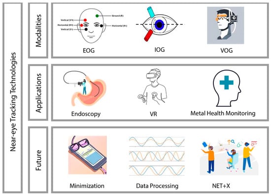 Therefore, this review synthesizes articles on health-related NET and provides a detailed overview of its technology, applications, as well as future directions. To conduct this review, we meticulously searched major academic databases, including PubMed, IEEE Xplore, and Google Scholar. Our search strategy employed a combination of keywords including: (“near eye-tracking” OR “NET”) AND (“wearable technology” OR “wearable devices” OR “health monitoring”) AND (“video oculography” OR “VOG” OR “infrared oculography” OR “IOG” OR “electrooculography” OR “EOG” OR “eye movement tracking”). This methodological approach allowed us to initially identify more than 70 related articles published over the past two decades. Additionally, the literature screening and review were conducted using explicit criteria tailored to the scope of our study. These criteria included the relevance of the studies to health-related domains, covering both clinical applications and healthcare. We meticulously identified and selected literature that specifically focused on NET technologies, as opposed to studies involving remote eye tracking where the distance exceeds 10 cm. Following this stringent selection process, we performed a more focused review of 25 articles from the past two decades with the details of devices and features. An overview of wearable near-eye tracking technologies for health is shown in Figure 1.