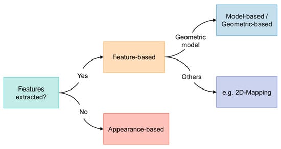 Based on existing reviews and literature, there are three main categories for methods in VOG: the feature-based, appearance-based, and model-based methods. However, our review revealed that the definitions and boundaries between these concepts are somewhat ambiguous, and these methods are often used in conjunction to fully leverage the acquired image or video data. Given this overlap and to streamline the classification, we propose categorizing these methods into two distinct groups: feature-based and appearance-based (Figure 2). It is noteworthy that the majority of the studies we reviewed employed the feature-based approach.
