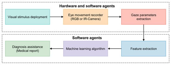 Figure 5 shows a typical processing pipeline for the diagnosis of cognitive impairment using machine learning (ML) algorithms. Initially, visual stimuli are deployed to provoke eye movements, which are then captured by a camera acting as an eye movement recorder. The software then analyzes these metrics to identify patterns indicative of cognitive impairments. ML algorithms further examine these features to detect abnormalities. The findings are then compiled into a detailed diagnostic report.
