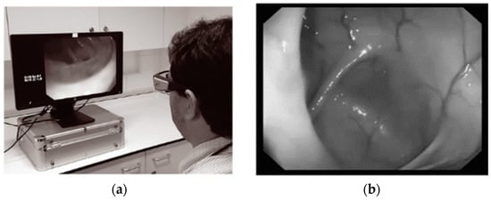 (a) User wearing eye tracking glasses observing withdrawal video. (b) Hepatic flexure on the left side of the screen. Endoscopic application [35].