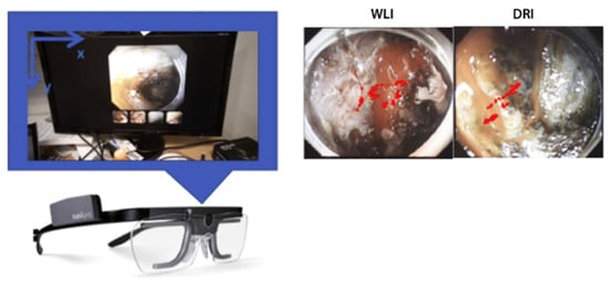 A subject wearing an eye-tracking device while searching for the bleeding point (left). The example of endoscopic images of the measured eye position attached to the infrared marker (right). WLI, White-light imaging; DRI, dual red imaging. Taken with permission from [56].