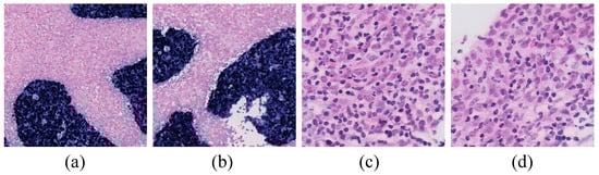 A review of previous studies on AI-based NPC diagnosis indicates that model training typically necessitates the manual annotation of H&E images by pathologists. However, NPC’s complex tumor microenvironment [,,,,], exemplified by lymphocyte infiltration (as illustrated in Figure 1), complicates the pathological diagnosis. Consequently, constructing a high-quality H&E-annotated training dataset incurs significant costs. Although some scholars have proposed using other staining methods to assist H&E annotation to improve efficiency, subjective annotation by non-pathologists may reduce data quality and increase semantic ambiguity in model training, thereby affecting the diagnostic effect of the model. Given the critical role of EBER staining specificity in diagnosis, it is feasible to leverage the distinctive image features of NPC tumor cells compared to other cells, such as lymphocytes, in H&E images for facilitating a digital staining conversion to EBER images. This approach could potentially allow for the indirect diagnosis of H&E images based on the specificity of EBER staining, thus potentially avoiding complex and subjective H&E image annotation while enhancing diagnostic accuracy.