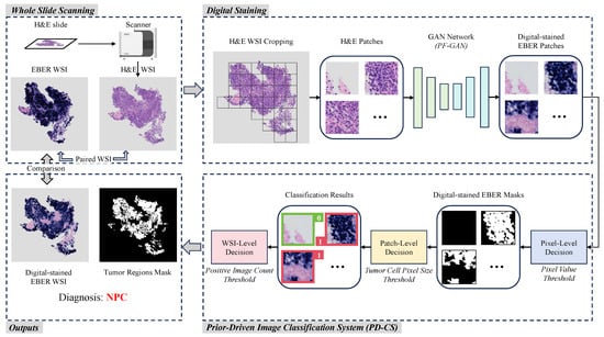 To overcome the limitations of current AI-based NPC diagnostic models, this study introduces a novel diagnostic framework named PFPD. This framework contains a generative adversarial network model (PF-GAN) incorporating pathology–fidelity constraints and a prior-driven image classification system (PD-CS). PF-GAN effectively transforms H&E images into EBER images to complete digital staining. Subsequently, PD-CS leverages the specificity of EBER staining and pathological prior knowledge to accurately classify these images, achieving NPC diagnosis. The high accuracy of PD-CS in classifying EBER images enables the automatic annotation of PF-GAN’s training data, significantly reducing annotation costs and minimizing subjective biases. The primary contributions of this work include: