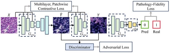 The primary goal of digital staining is to use models to learn image feature mappings under different staining conditions, achieving image conversion from the source domain to the target domain . The PF-GAN model, inspired by the CUT model, employs a generator and a discriminator and integrates adversarial generation with contrastive learning to train on unpaired instances; and . Distinct from the CUT model, PF-GAN incorporates a classifier during training and introduces pathology–fidelity constraints, which guide the generator in maintaining pathological consistency throughout the image generation process. The loss function for the PF-GAN, denoted as , is defined as follows:
