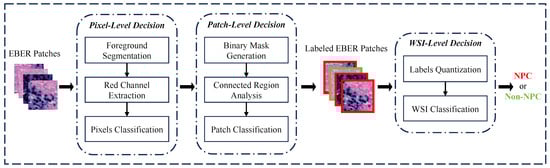 In the WSI-level decision module, the pathologist’s diagnostic criteria determine that the case is classified as nasopharyngeal carcinoma (NPC) if tumor cells are observed in the EBER images. Based on the pathological prior knowledge regarding tumor cell counts, we gather the number of positive EBER images to establish the final WSI-level classification criteria. If a positive EBER image is identified, the entire WSI is diagnosed as NPC; otherwise, it is categorized as non-NPC. This criterion follows the pathologist’s usual decision-making process.