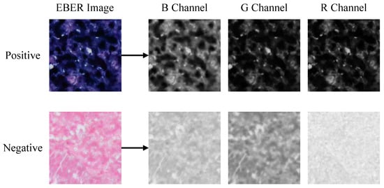 In the pixel-level decision module, we analyzed EBER image channels and noted higher pixel values in the R channel for negative images, as shown in Figure 5. The histograms in Figure 6 further demonstrated that negative images cluster in high-intensity ranges (greater than 200), whereas positive ones occupy low-intensity areas (less than 100), showcasing the R channel’s discriminative efficiency. Utilizing the specificity of EBER staining, the pixel-level decision module achieves pixel-level thresholding. This module first filters out background pixels and then extracts the R channel pixel values of the foreground. Pixels with values less than 100 are classified as positive, and those with higher values are negative.