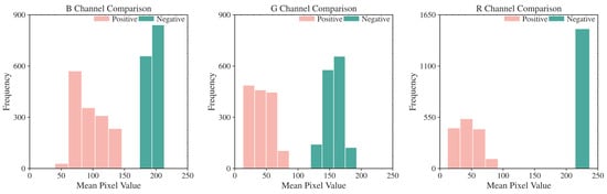 Visualization of RGB channels’ separation for positive and negative EBER images. The most significant difference between positive and negative is observed in the R channel, followed by the G and B channels.