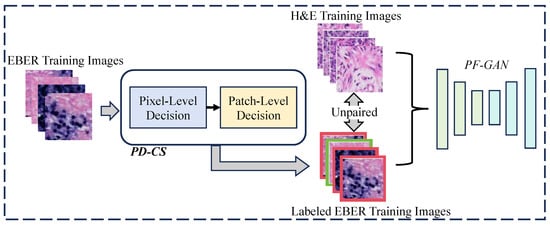 The process of automatic annotation. For PF-GAN training, EBER images are input into the PD-CS system, where annotation is accomplished using its pixel and patch modules. The labeled EBER images and unpaired H&E images are used together as training data for PF-GAN, enabling fully automatic annotation without manual intervention.