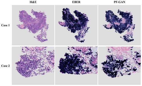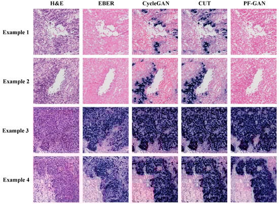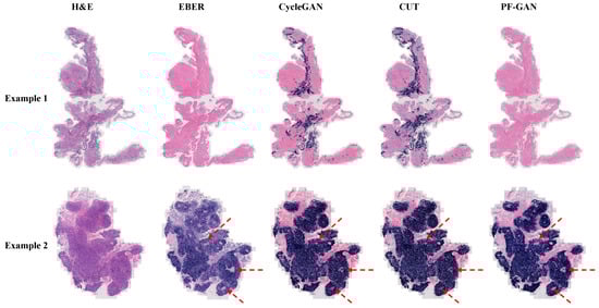 In Example 1 of Figure 8, for negative WSIs, CycleGAN and CUT exhibit a certain degree of over-staining. This over-staining can be attributed to the absence of pathology–fidelity loss in these GANs, resulting in converted images that lack authenticity and fail to preserve the pathological consistency of the original H&E-stained images. In contrast, PF-GAN successfully converts to the correct EBER-negative staining, demonstrating that pathology–fidelity loss ensures consistent stain conversion, with non-NPC cells in the H&E-stained images remaining negative in the converted EBER images.