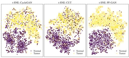 By extracting the feature maps from the last layer of the GAN generator encoder and performing average pooling to reduce dimensionality, feature vectors were obtained for t-SNE analysis. Figure 11 presents the t-SNE visualizations of the CycleGAN, CUT, and PF-GAN models, used to compare the models’ performance in feature separation. Purple dots represent non-NPC data in these visualizations, and yellow dots represent tumor data. The t-SNE plots of the CycleGAN and CUT models show significant overlap between non-NPC and NPC tumor data points, indicating poor separation performance. Specifically, numerous non-NPC data points are intermixed within the tumor clusters, suggesting these two models are ineffective in distinguishing between non-NPC and tumor features.
