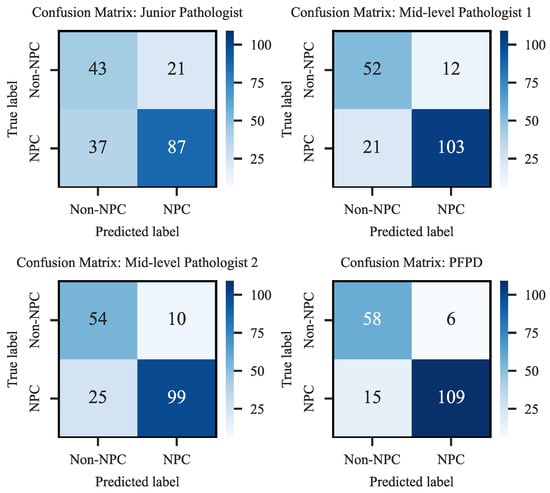 To further validate the clinical efficacy of PFPD, we conducted a diagnostic comparison experiment on H&E-stained WSIs from 188 cases in the test set, comparing the results obtained from PFPD with the diagnosis provided by three pathologists. These experts include one junior and two mid-level pathologists, who independently diagnosed these H&E images without the aid of EBER and other staining images. The relevant diagnostic results and confusion matrix are detailed in Figure 12.