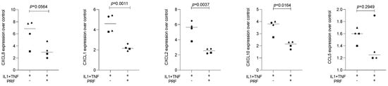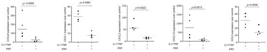 PRF lysates suppress IL1β- and TNFα-induced chemokine expression in HSC2 cells. The oral squamous cell carcinoma cell line HSC2 was exposed to IL1β and TNFα in the presence or absence of PRF lysates. Gene expression analysis was performed the following day. Data points represent four independent experiments. Data were normalized to untreated control cells with x-fold changes compared to the untreated cells. The statistical analysis was based on the ratio paired t-test and p-values reported.