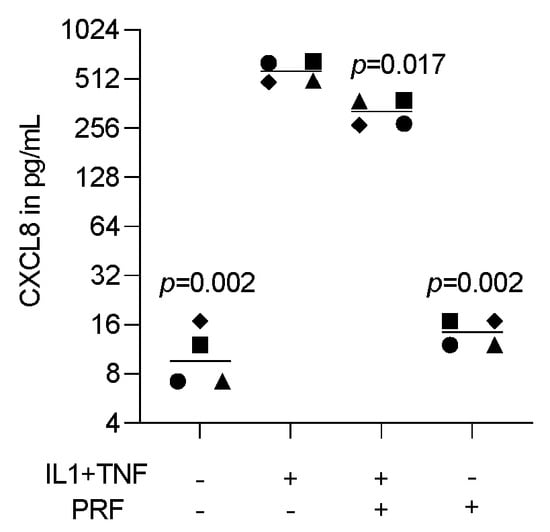 To assess the effect of lysates prepared from solid PRF, HSC2 cells were exposed to IL1β and TNFα before chemokine expression was analyzed. We recently identified a chemokine panel consisting of CXCL1, CXCL2, CXCL8, CXCL10, and CCL5 to be highly upregulated by IL1β and TNFα in HSC2 cells []. When HSC2 cells were exposed to PRF lysates, the forced expression of all five chemokines was significantly reduced (Figure 1). Support for these findings comes from immunoassay using the lysates of IL1β- and TNFα-treated HSC2 cells exposed to PRF lysates; in this setting, PRF lysates significantly lowered the CXCL8 levels in the cell lysates (Figure 2). Taken together, lysates prepared from solid PRF can reduce IL1β- and TNFα-induced chemokine expression in HSC2 cells.