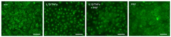 Immunofluorescence analysis of p65 nuclear translocation was performed in HSC2 cells. The cells were plated on Millicell EZ slides (Merck KGaA, Darmstadt, Germany) at a 15,000 cell/cm2 density and subjected to serum starvation overnight with 30% PRF lysates. To induce inflammation, the cells were exposed to IL1β and TNFα for 40 min. The cells were fixed with 4% paraformaldehyde, blocked with 1% bovine serum albumin (Sigma-Aldrich, St. Louis, MO, USA), and permeabilized with 0.3% Triton X-100 (Sigma-Aldrich, St. Louis, MO, USA). We used anti-p65 antibodies (IgG, 1:400, Cell Signaling Technology, #8242, Danvers, MA, USA) at 4 °C overnight. Detection was performed with a goat anti-rabbit Alexa 488 secondary antibody (CS-4412, 1:800, Cell Signaling Technology). Images were captured on a fluorescence microscope with the DAPI-FITC dual excitation filter block (Echo Revolve fluorescence microscope, San Diego, CA, USA).
