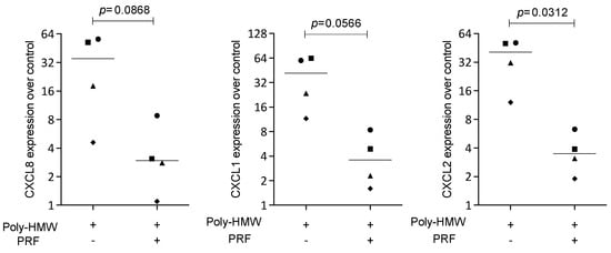 To confirm the findings observed for the IL1β- and TNFα-induced inflammation, HSC2 cells were exposed to poly(I:C) HMW, the agonist of TLR3, in the presence or absence of solid PRF lysate. Lysates of PRF reduced the expression of CXCL1, CXCL2, and CXCL8 provoked by poly(I:C) HMW in HSC2 cells (Figure 5). Overall, these findings suggest that the reduction in chemokine expression by PRF lysates can be extended towards TLR-3 agonists in HSC2 oral epithelial cells.