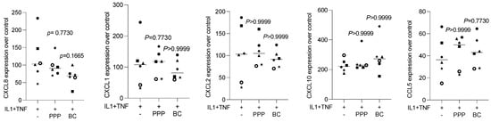 PPP and buffy coat lysates had no impact on IL1β- and TNFα-induced chemokine expression in HSC2 cells. The oral squamous cell carcinoma cell line HSC2 was exposed to IL1β and TNFα in the presence or absence of PPP and buffy coat (BC) lysates. Gene expression analysis was performed the following day. Data points represent independent experiments. Data were normalized to untreated control cells with x-fold changes compared to the untreated cells. The statistical analysis was based on the Friedmann test, and p-values were reported.
