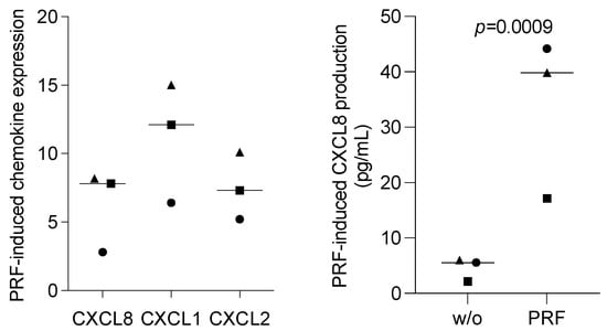 PRF lysates enhanced the CXCL8 production of primary oral epithelial cells. Primary oral epithelial cells were exposed to PRF lysates. Gene expression analysis was performed the following day. Data were normalized to untreated control cells with x-fold changes compared to the untreated cells (left panel). The supernatant was harvested and subjected to immunoassay (right panel). Data points represent three independent experiments. The statistical analysis was based on the ratio paired t-test and p-values.