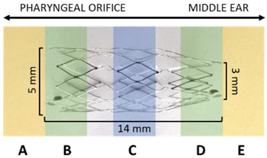 In a few studies, patients even received support for the ET lumen after different interventions. Angiocatheters were used provisionally serving as ET stents in humans after surgical interventions, e.g., ET reconstruction [30] and nasopharyngectomy [31]. Angiocatheter placement in the ET was proven to be more successful than tympanostomy tube placement in the prevention of otitis media with effusion (OME) after nasopharyngectomy surgery [31]. However, it was necessary to regularly remove crusts from the end of the catheter, which protruded into the pharynx. In one case, a ureteral stent was cut to size and implanted after recanalization of an obliterated ET to maintain the neo-lumen [32]. These approaches emphasize the need for stents for the ET. As shown by Pohl et al. [27] using cardiovascular stents in vivo in sheep, the shape and length of the stents need adjustments to fit the ET. This was also confirmed by Kim et al. after CoCr stent placement in the ETs of three pigs [26].