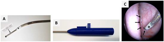Application tool with tip (A) and handle (B) forwarded (C) into the crescent-shaped pharyngeal ET opening (arrows) with a white depth marker (*) to control insertion depth.