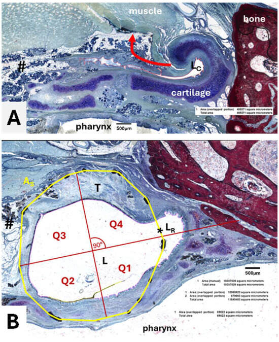 Histological sections of the Eustachian tube. (A) Cross-sectional view of a control ET with an arrow indicating the movement during pressure equalization. Lumen of control (LC, surrounded by a red line), Ostmann fat pad, and glandular tissue (#) are indicated. (B) Cross-sectional view of cutting section C with area of the stent (As, yellow line), stent lumen (L), ingrown tissue (T), residual tubal lumen (LR), and the quadrants (Q1–Q4). The dividing lines of the quadrants were defined by a first line from the center of the stent to the center of the intersection (*) between the stent and the residual lumen and a subsequent orthogonal line.