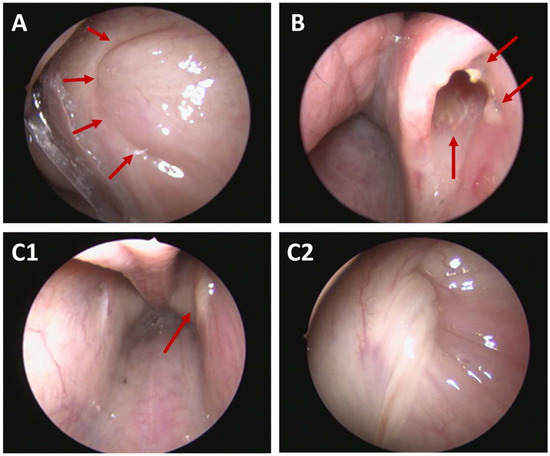 Endoscopic view of Eustachian tube orifices. (A) Closed left ET (arrows) with normal secretion (score 0) at 12 months post-stent insertion (12M-2). (B) Severely open ET with visible stent (arrows) at 1.5 months after stent was applied too close to the ET opening with insertion depth <50% (3M-7). (C1,C2) Abnormal secretion (arrow, score 3) in overview of both ET openings (C1) and in close-up of the left side (C2) at 3 months follow-up (6M-4).