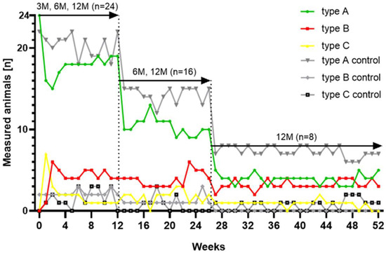 The first valid measurement of each week was included. Type A (green), type B (red), and type C (yellow). For incomplete measurements (white boxes) of animals 12M-7 (n = 1) and 12M-8 (n = 2), the values from the previous week were assumed.